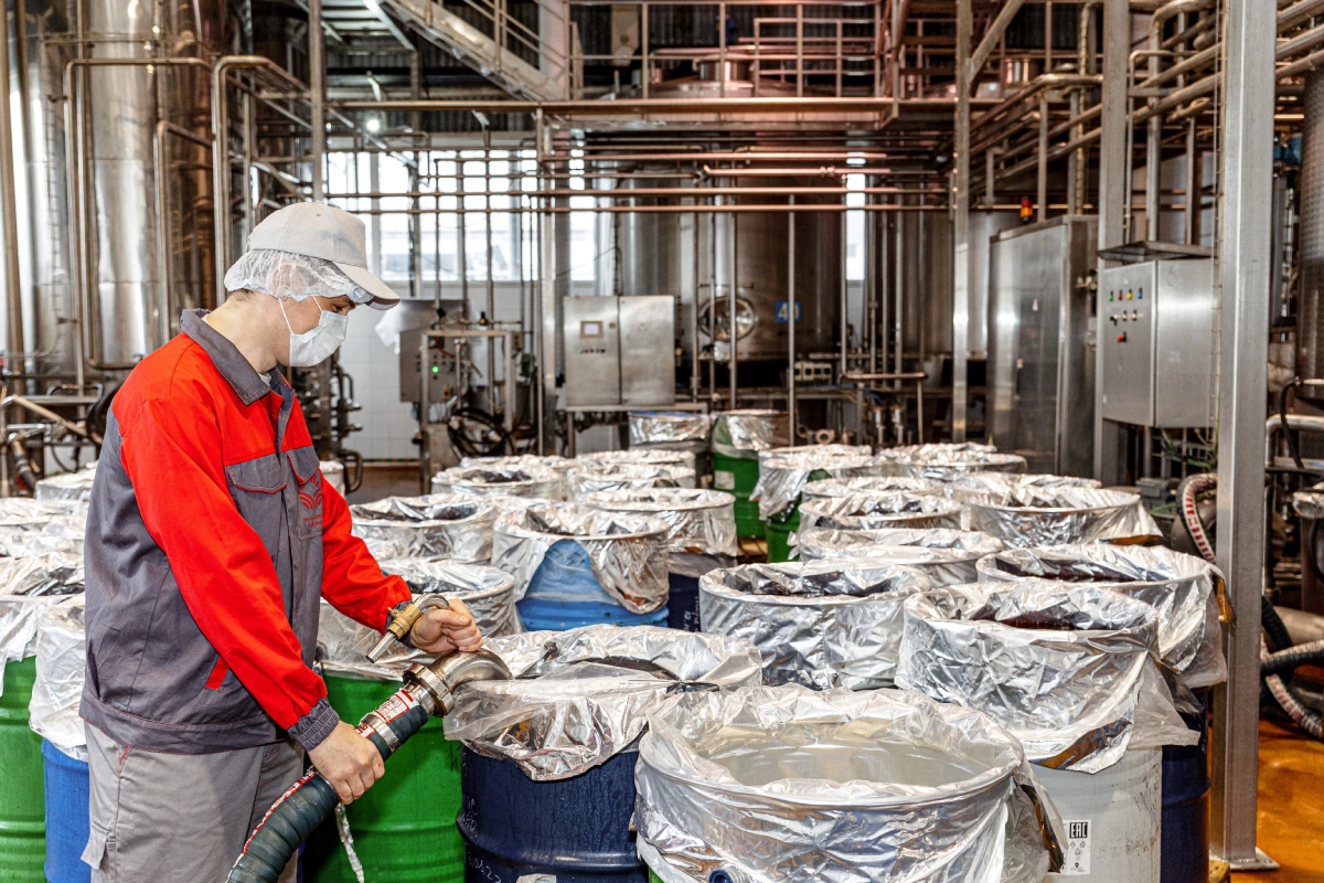 Очевидно, что яблоки, как и любые другие фрукты и овощи, — продукт сезонный. И некоторые покупатели задают нам вопрос: «Как возможен прямой отжим в январе или апреле?» Ответ кроется в асептическом розливе. Сок прямого отжима мы разливаем в бочки, внутрь которых помещаем асептический мешок. В таком виде напиток может храниться год. И как только получаем заказ от ВкусВилла на очередную партию, мы перекачиваем сок из бочек в купажную ёмкость, где смешиваем его, фильтруем, пастеризуем и разливаем в пакеты.