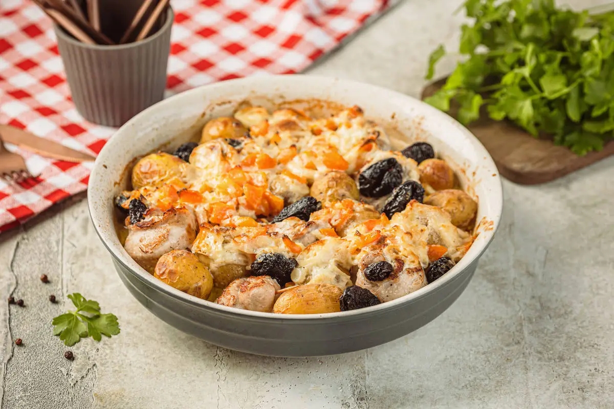 Как вы уже поняли, кролик и чернослив — беспроигрышное сочетание. В этом рецепте к ним добавляется картофель, и это отличный гарнир. А добавление вина превращает блюдо не просто в праздничное, но и в изысканное.