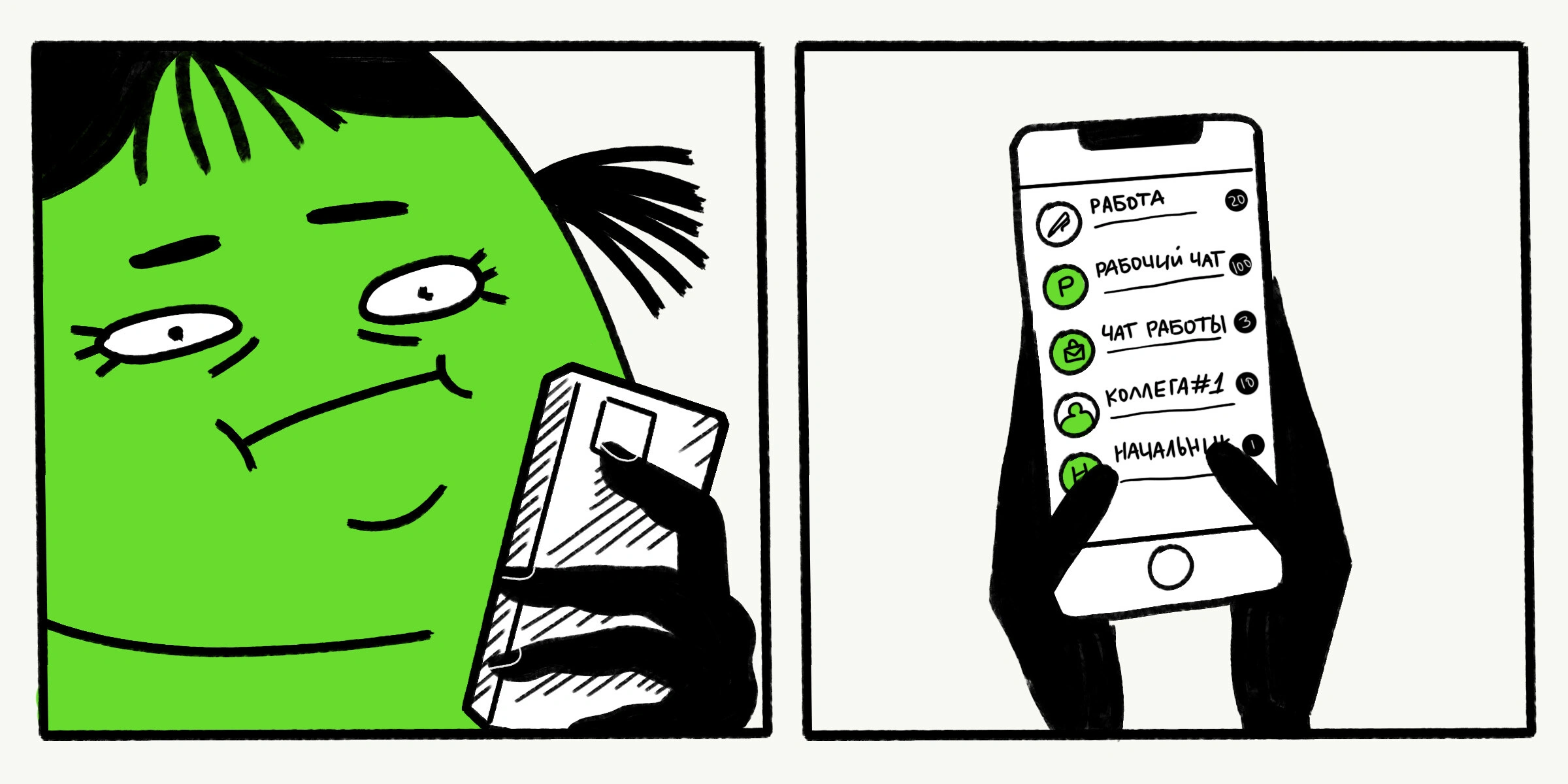 — Ну… когда я приползаю домой, обычно включаю на фон подкаст «Голодные люди», могу отвлечься на рабочие задачи, параллельно переписываюсь с майским жуком, грызу мятный лист и сильно тревожусь о том, что ничего не успеваю.
