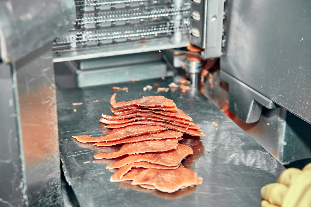 Рыба режется на ломтики на автоматическом дисковом слайсере. Перед тем как пустить тушки на слайсер, их подмораживают для более равномерной и качественной нарезки