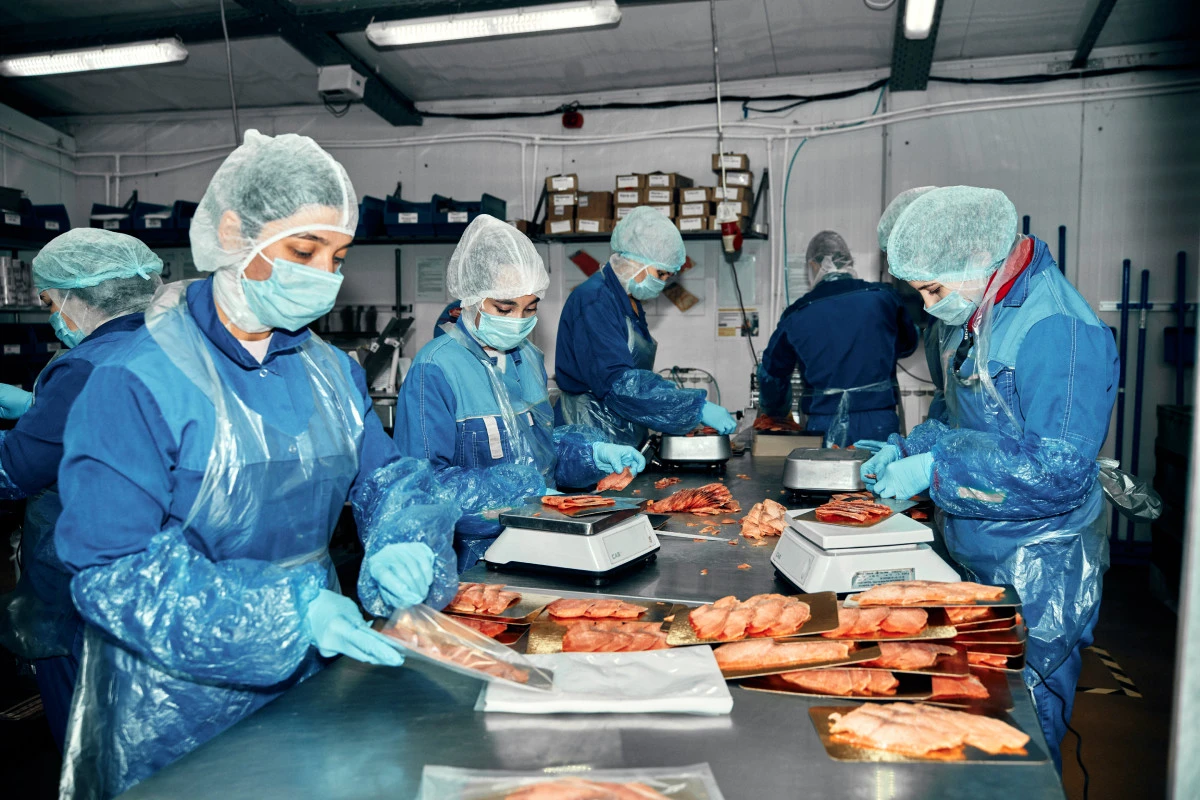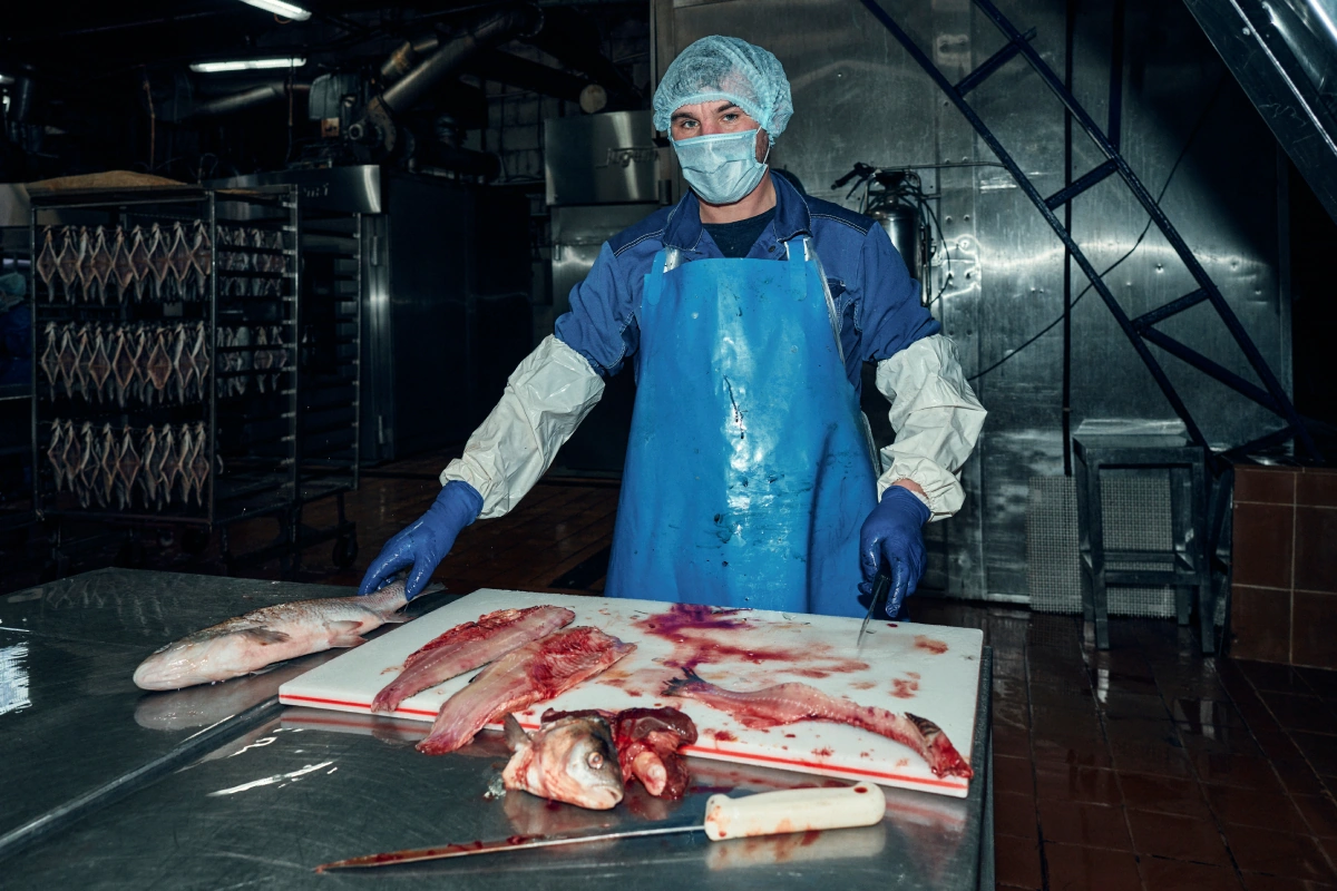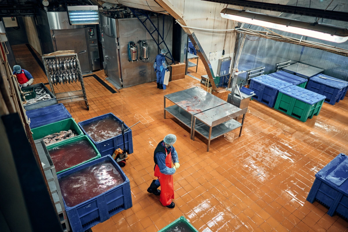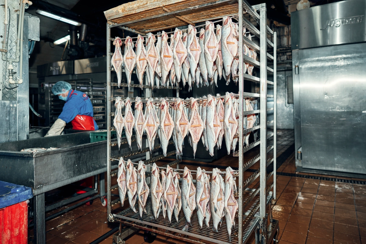 На рыбном производстве влажно, подошвы ботинок хлюпают на мокром полу. Поставщик заверяет, что так и положено: работать с рыбой не булочки печь. Сухо тут быть не может: полы моют каждые два часа, рыбу замачивают в соляных растворах и обрабатывают проточной водой перед разделкой и копчением.