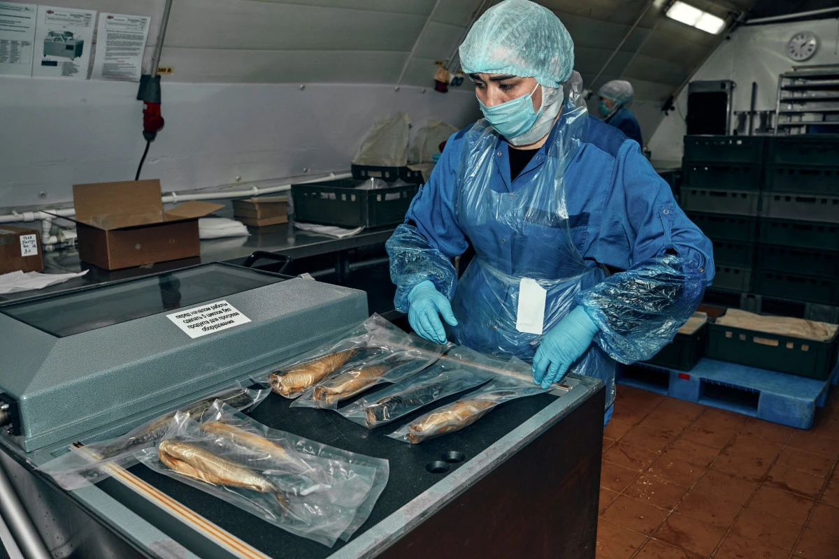 Тонкие кусочки рыбы раскладывают на подложки и вакуумируют