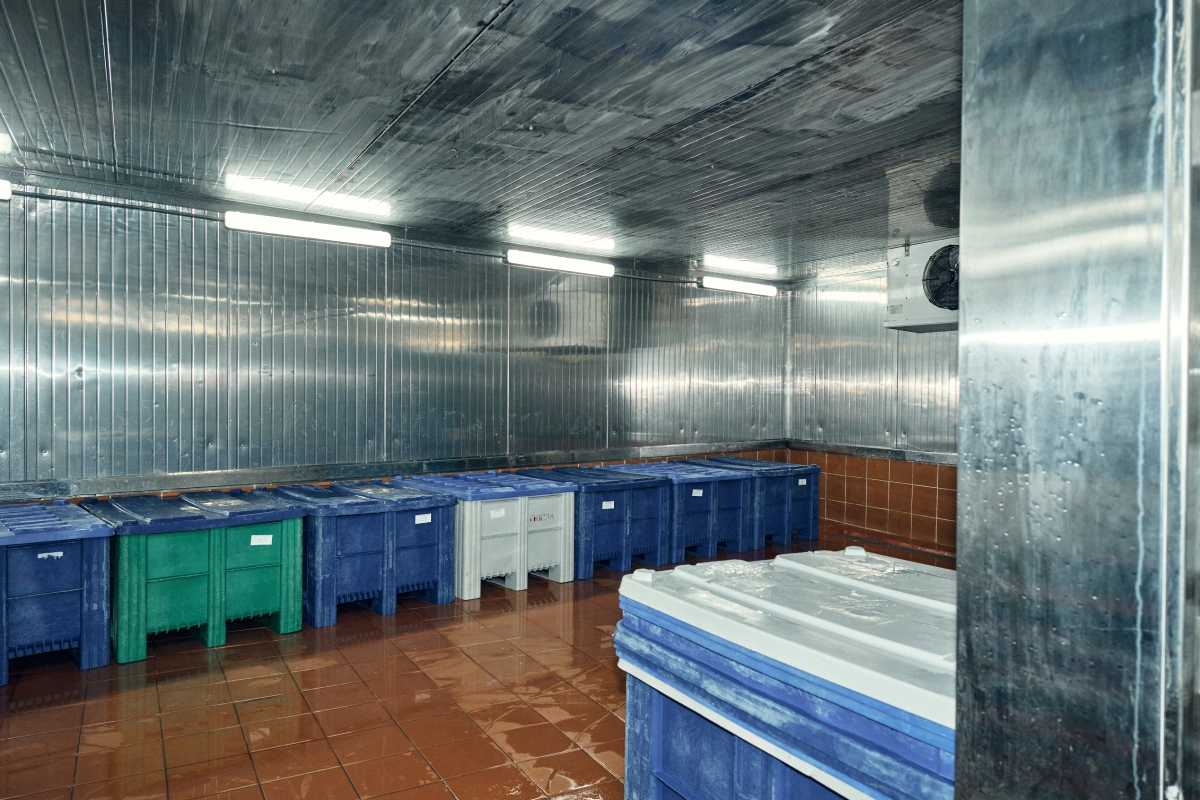 Начинается работа с «растарки» замороженной рыбы. На сленге поставщика так называется освобождение рыбы от упаковки, после чего продукт помещают в чистую ванну, наполненную водой, для первичного очищения от микробов. Затем размораживают до -2° воздушным способом на стеллажах или используют для быстрой разморозки дефростер.