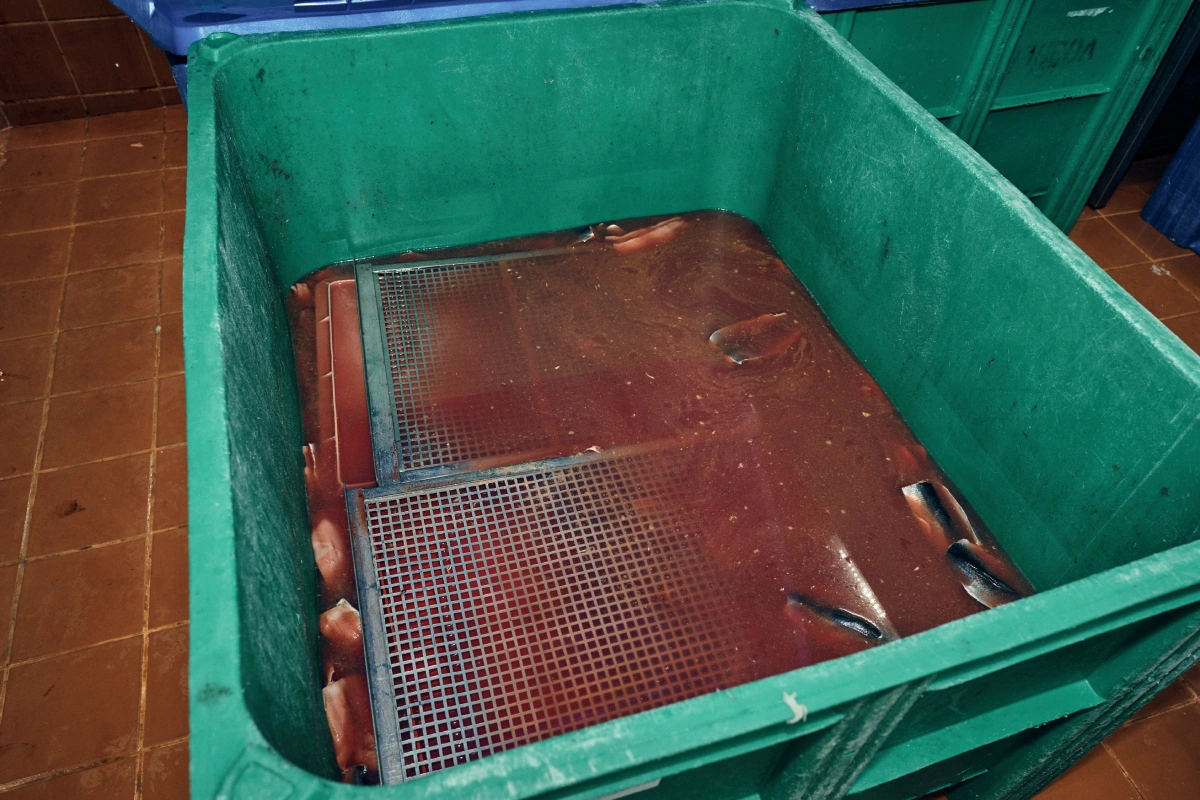 При посоле важно, чтобы соль впиталась в тушку равномерно. Для этого рыбу целиком погружают в ванну и придавливают грузом, чтобы не поднималась наверх. Бывает, что даже при полном погружении рыба не просаливается полностью — тогда её отправляют на распределение или, иначе говоря, на выравнивание. Звучит интригующе. На деле рыбу просто погружают в ванну с солевым раствором и оставляют на время. Чтобы убедиться, что соль распределилась равномерно, берут анализ из разных частей рыбы — он показывает, сколько соли содержится в каждом сегменте.