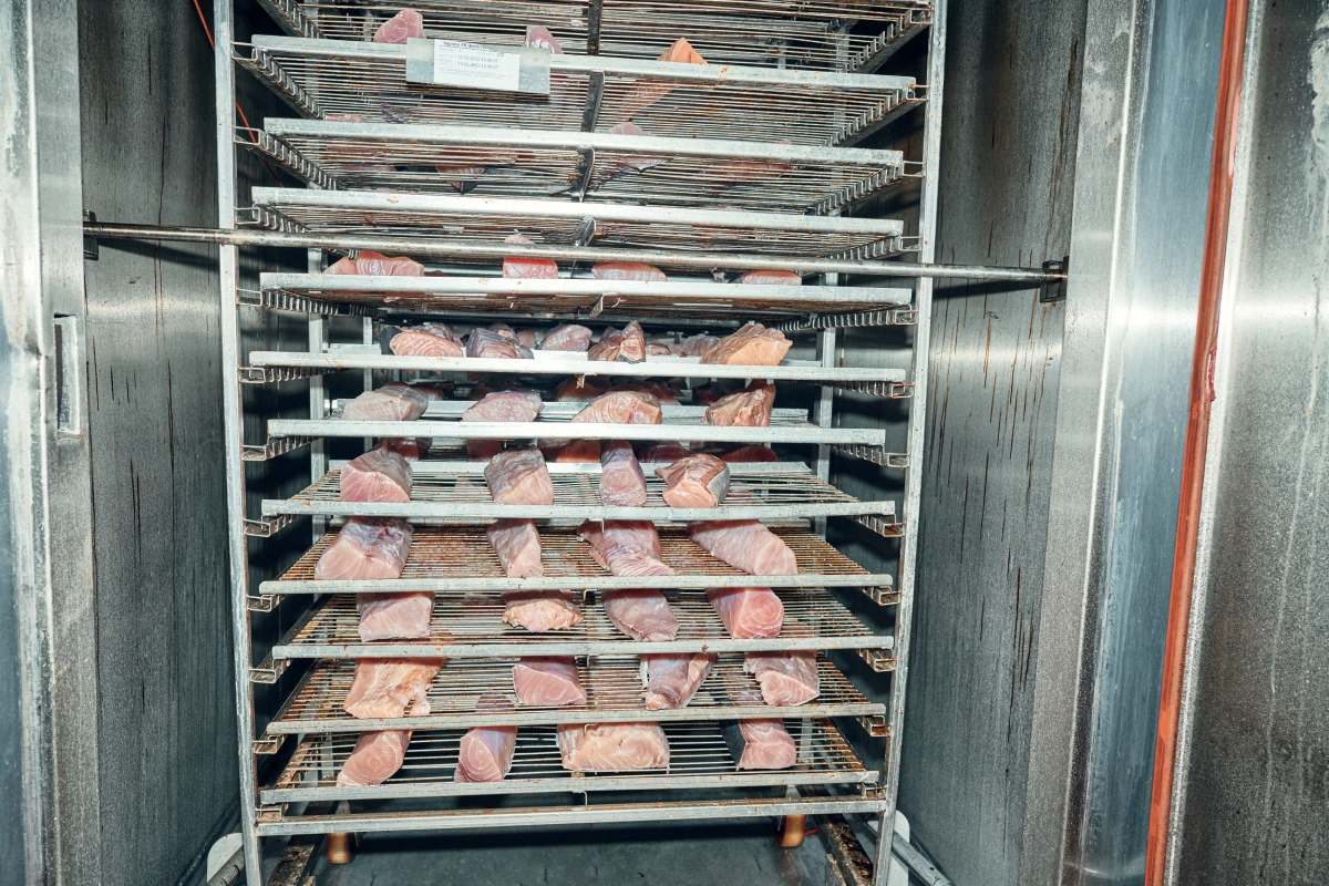 Рыба холодного копчения сушится при +24°, а горячего — при +80. Весь процесс холодного копчения состоит из следующих циклов: сначала рыбу около трёх часов сушат, затем пускают дым на два часа, а после снова сушат столько же, сколько и в первый раз. Дым выделяет ольховая щепа, никакого жидкого ароматизатора поставщик не использует. По его словам, это не столько вредно, сколько меняет вкус готового продукта. Жидкий дым даёт рыбе химический привкус, а ещё на выходе получается неравномерный неестественный цвет.