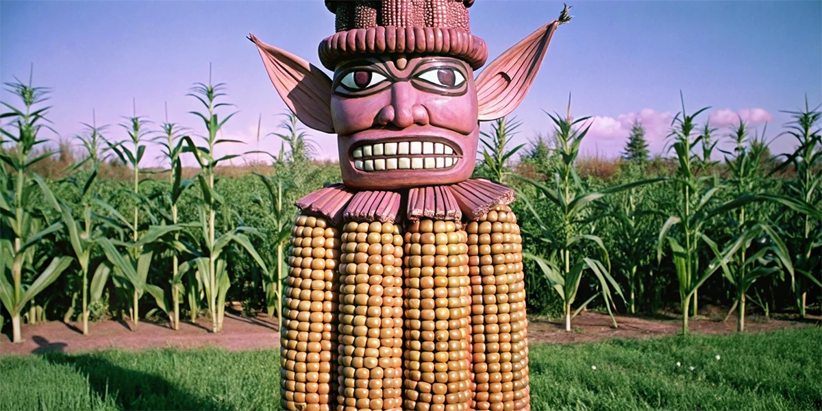 Интересно здесь то, что если обратиться к реальной истории кукурузы, замысел становится своеобразной инверсией древних обрядов ацтеков. В древней Мезоамерике (территория современной Мексики и Гватемалы) проводился ритуал, посвящённый богине кукурузы, известной как Чикомекоатль. В сентябре, когда созревала кукуруза, старейшие представители племени выбирали несовершеннолетнюю девушку в качестве богини, наряжали в колпак, платья и обувь, чтобы она была похожа на початок. 10 дней танцевали, устраивали подношения и трапезы, а в последнюю ночь молодая богиня должна была плясать до упаду, синхронизируясь с циклом дня и ночи. Наутро ей отрубали голову — это было кульминацией жертвоприношения.