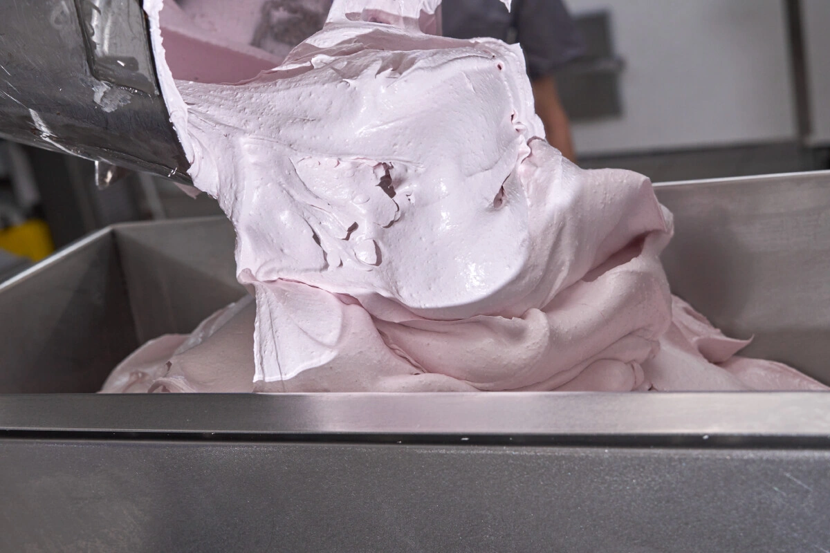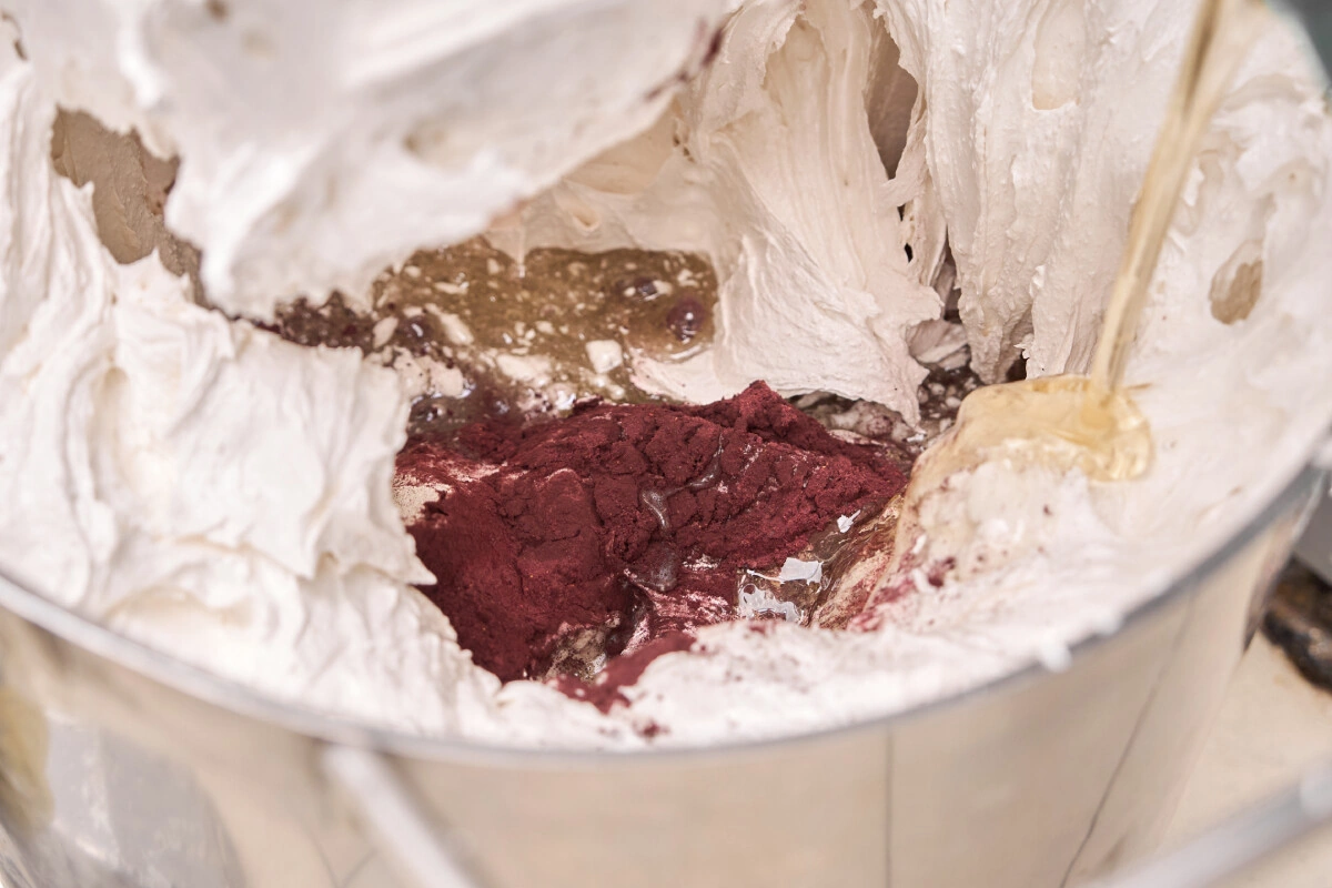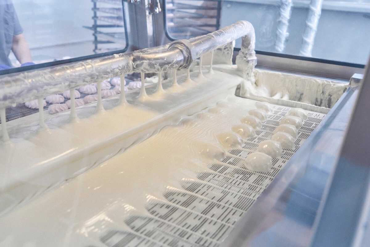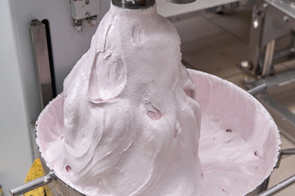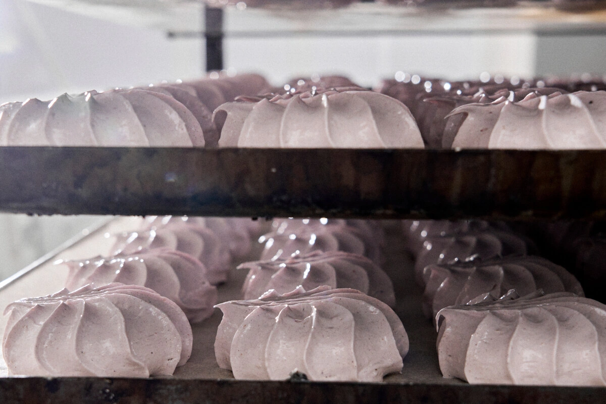 Здесь есть отдел, который постоянно анализирует потребительские запросы, но в то же время главным ориентиром фабрики всегда был «вкус из детства». Одно из главных правил этого производства — использовать максимально натуральные ингредиенты. Так, для создания черничного зефира, партию которого производили на наших глазах, взяли сушеную измельченную чернику без добавок и ароматизаторов.