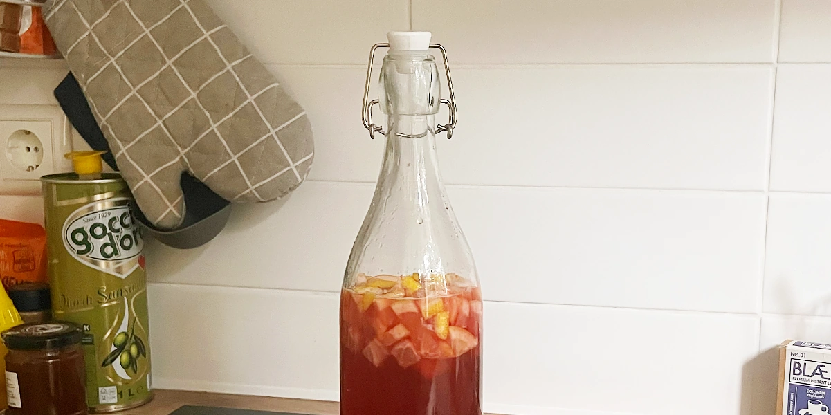 2. Вторичная ферментация. Требуется, если мы хотим получить комбучу с дополнительным вкусом. В готовый после первичной ферментации напиток добавляют фрукты, ягоды, пряные приправы, травы. Его заливают в подготовленные ёмкости и оставляют на несколько дней. В результате получается новый вкус комбучи.