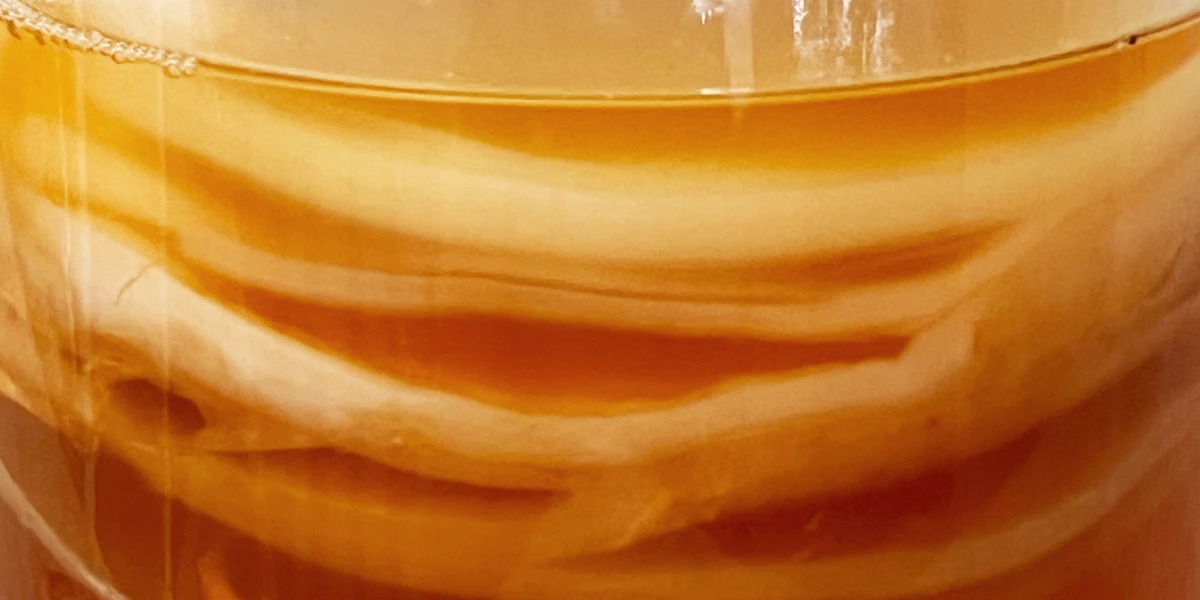 Непонятная желеобразная штука в банке с чайным грибом — это не настоящий гриб, а SCOBY (Symbiotic Culture of Bacteria and Yeast). Он выглядит, как плотная плёнка или диск, и состоит из симбиотической культуры бактерий и дрожжей. Хотя эту «медузу» и называют чайным грибом, отношения к грибам в биологическом смысле она не имеет.