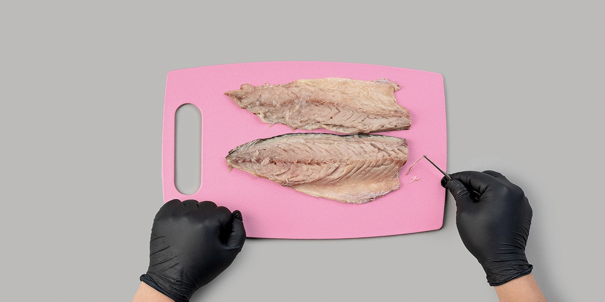 - Проведите пальцами по филе, нащупайте кости и осторожно удалите их с помощью пинцета, придерживая мясо рукой с противоположной стороны.