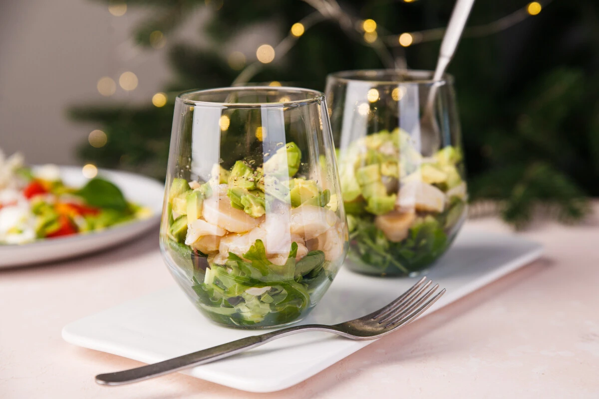- В широкие стаканы выложите листья салата, сверху — кубики огурца и ломтики авокадо, потом гребешки. Украсьте кубиками авокадо. Севиче можно также сервировать на тарелках или в креманках. Подавайте сразу или оставьте в холодильнике до подачи, накрыв плёнкой, но не больше чем на 3–4 часа.