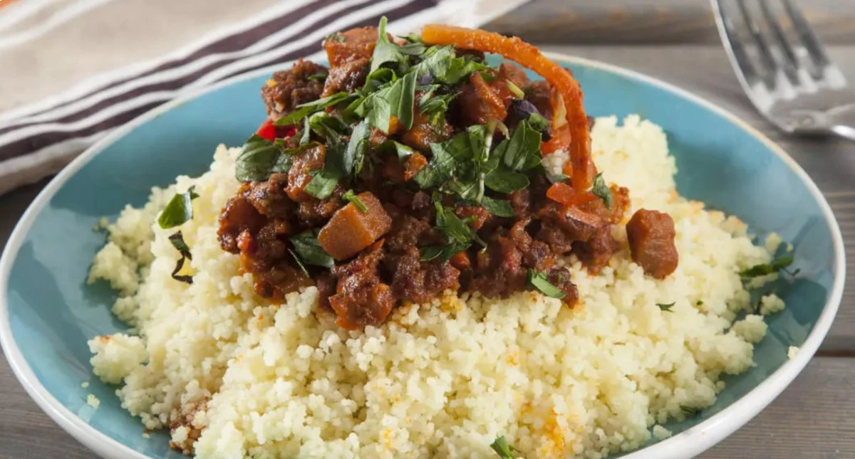 Чаще на полках встречается марокканский вид кус-куса — мелкий, чуть крупнее манки. Готовится он молниеносно: залейте кипятком, накройте крышкой и дайте постоять несколько минут — полезный и сытный гарнир готов. А основное блюдо может быть каким угодно — мы предлагаем говяжий фарш с овощным соте.