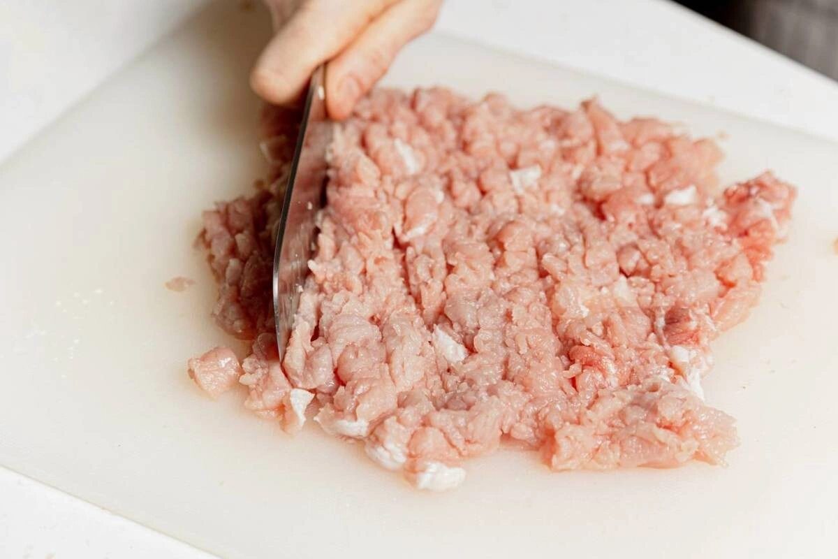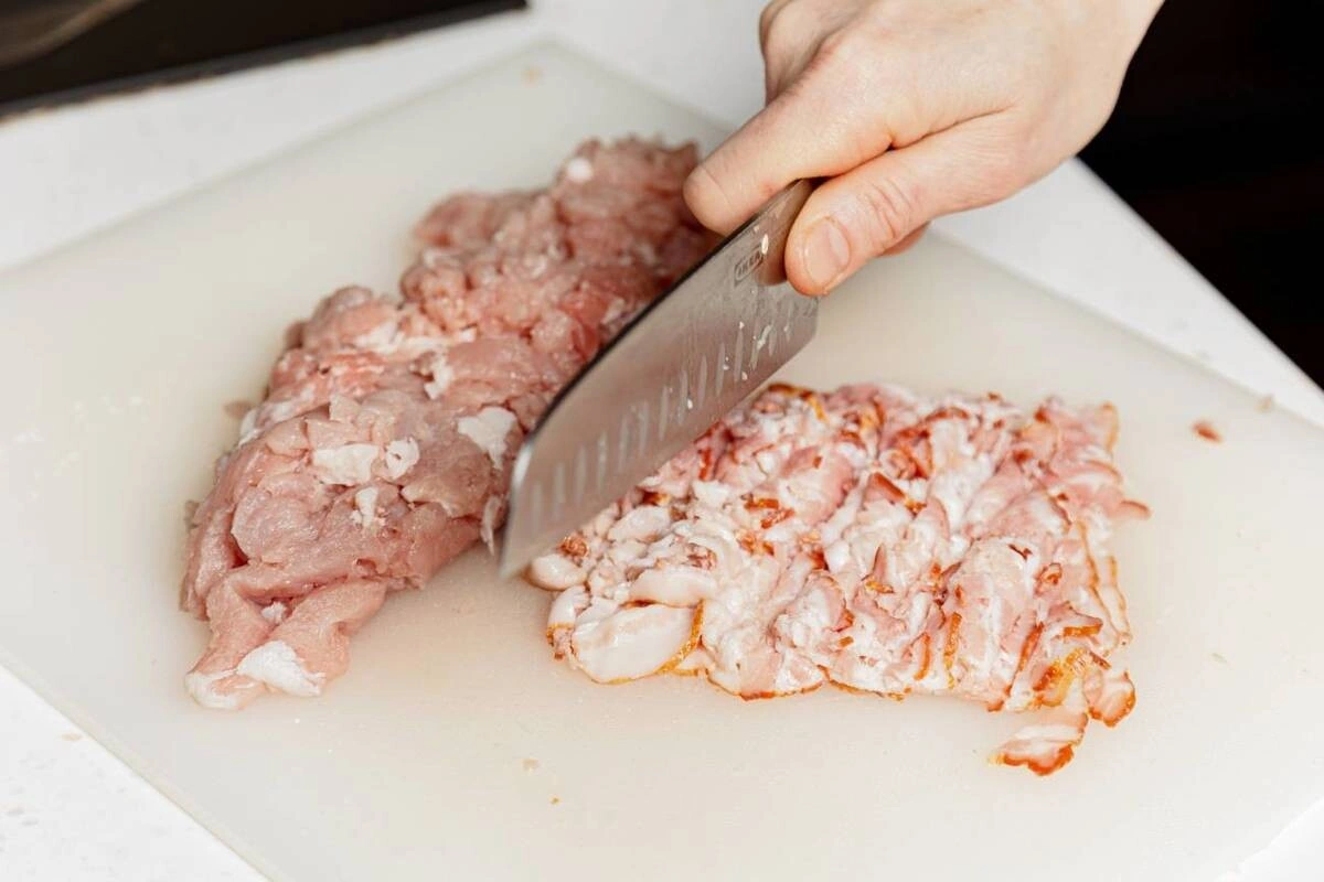 - Свинину нарежьте полосками, а затем мелко нарубите ножом. Мелко порубите бекон, добавьте к мясу, посолите и поперчите. Можно также мелко нарубить в котлеты вяленые томаты или добавить сыр. Вымесите руками и отбейте фарш.