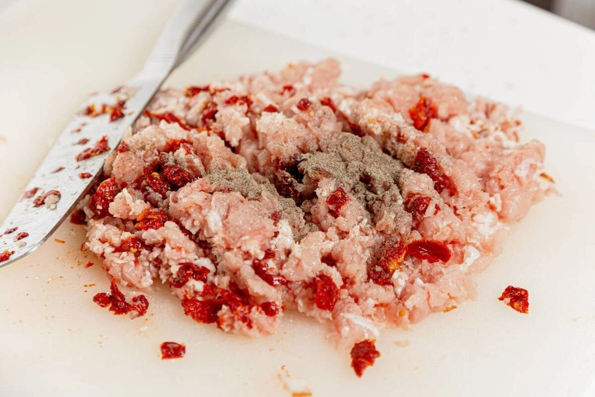 - Приготовьте свиные котлеты по рецепту, написанному выше, добавив в фарш штук 6 вяленых томатов для пикантности вкуса.