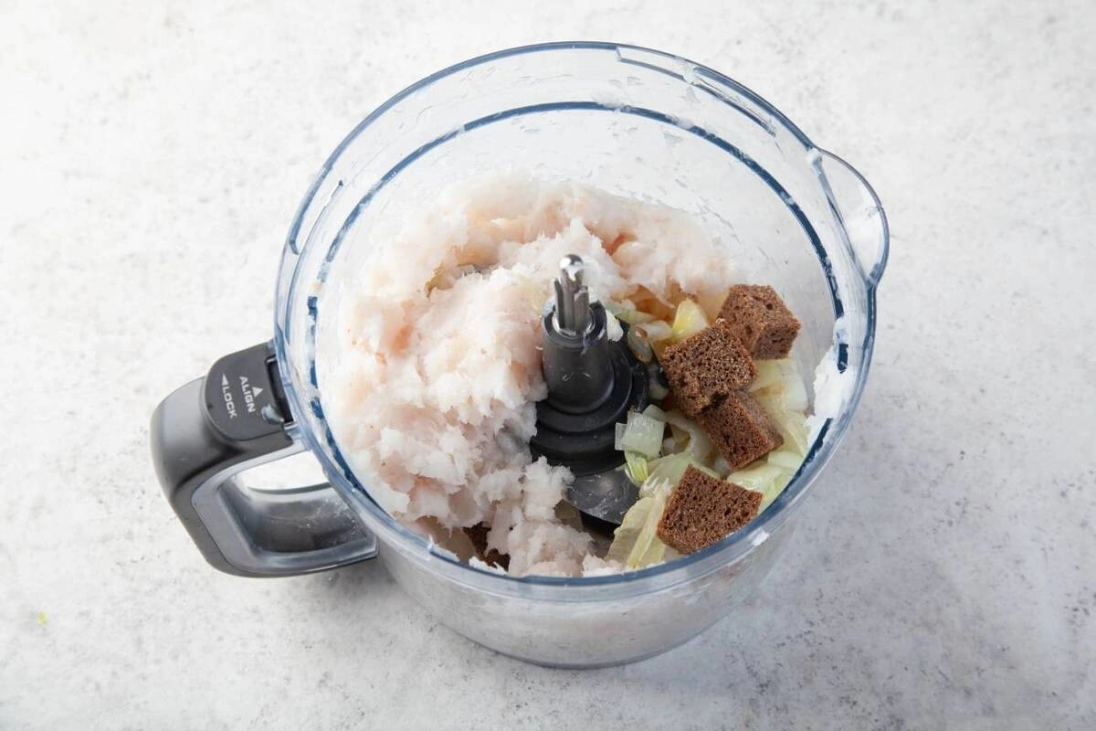 - Филе трески нарежьте произвольно, измельчённый лук при желании обжарьте. В блендер сложите все ингредиенты, пробейте в фарш. Спрессуйте две рыбные котлеты, если они плохо держат форму, обваляйте в сухарях. Обжарьте на сковороде или на противне для гриля.