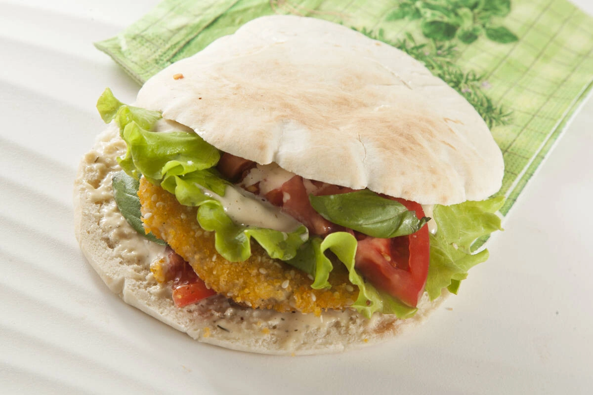 - Намажьте нижнюю половинку соусом, выложите кружок помидора, листья базилика и горячую котлету, сверху полейте соусом, добавьте ещё кружок помидора и листья салата, накройте вторым кусочком питы.