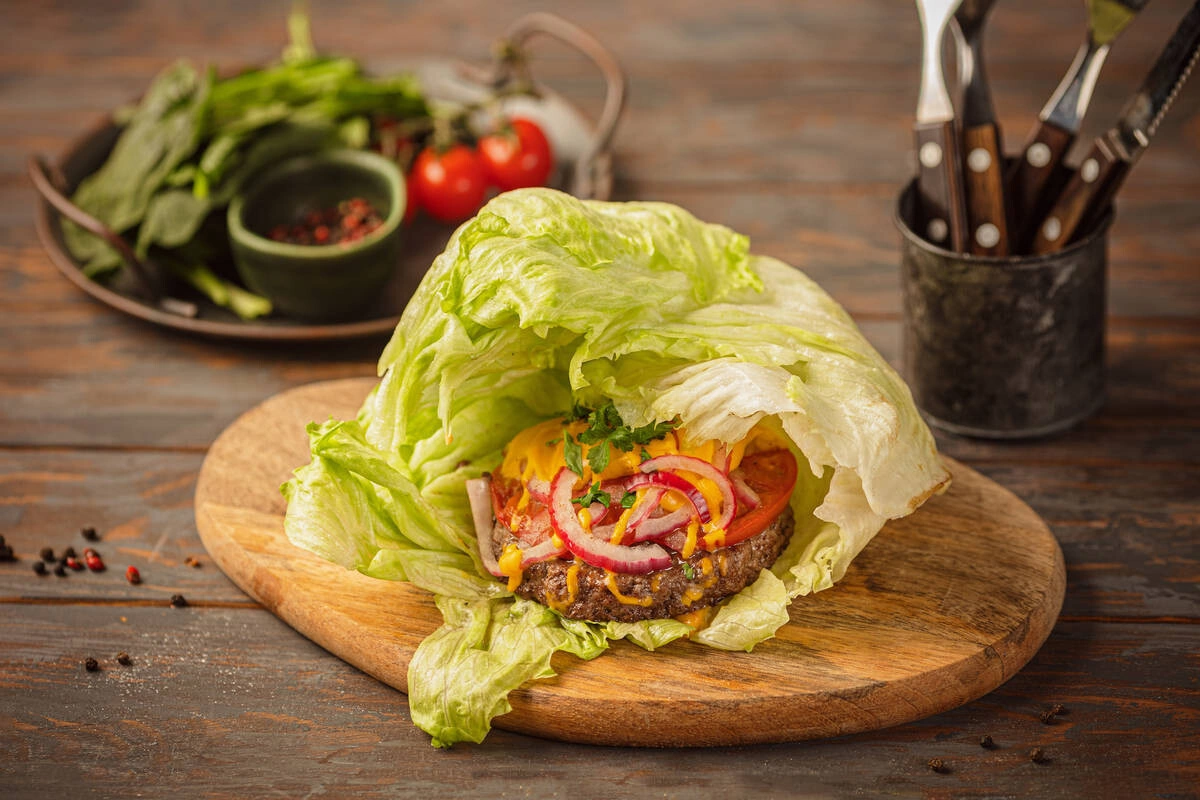 - Айсберг разберите на листья, для одного бургера вам понадобится 2-3 крупных листа. Выложите котлеты на лист, сверху положите помидор и маринованный лук, полейте соусом Чеддер, украсьте петрушкой.