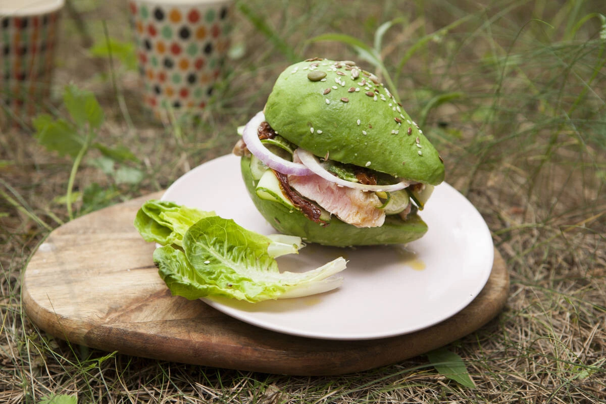 В этом рецепте вместо булочек для бургера используются половинки авокадо, и такая подача мало кого оставит равнодушным. Филе тунца — не слишком жирная рыба, поэтому отлично сочетается с авокадо. Учтите, что бургер получается очень сытным — возможно, кому-то будет достаточно и половинки.