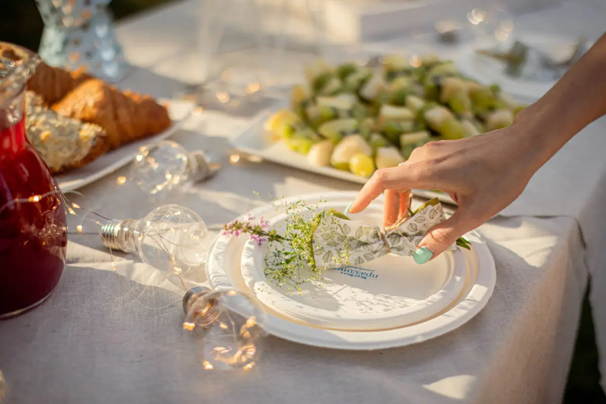 Что касается посуды, лучше обойтись без тонких белых пластиковых тарелок и стаканчиков. Как альтернатива — бумажные наборы для пикника, но лучше всё же пластиковая (или металлическая) многоразовая посуда. Её не унесёт ветром, она удобнее для горячего и когда приходится есть на весу.