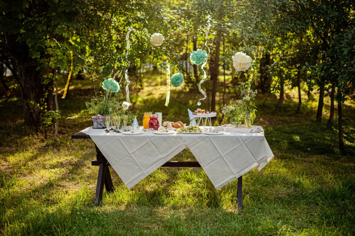 - Если планируете привезти стол или он есть на месте, обязательно используйте красивую скатерть.