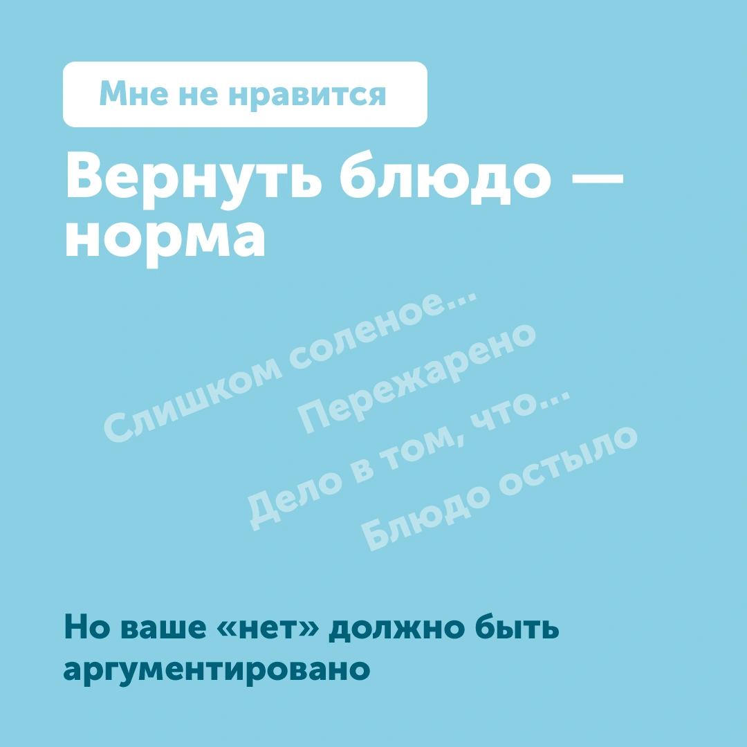 Сказать такую вещь — создать для себя психологически дискомфортную ситуацию. Но делать это нужно, если вы не хотите, чтобы ваше любимое место испортилось. Адекватный повар отреагирует на замечание с пониманием. Важно сознавать, что именно вам не нравится: суп холодный, салат пересолен, стейк пережарен. А вот аргумент «просто не нравится» обычно не принимается. Гораздо правильнее сказать об ошибке повара сразу, чем оставить разгромный отзыв потом. Кстати, это может сэкономить вам деньги: за блюдо, которое вы вернули на кухню, рестораны обычно не берут оплату.
