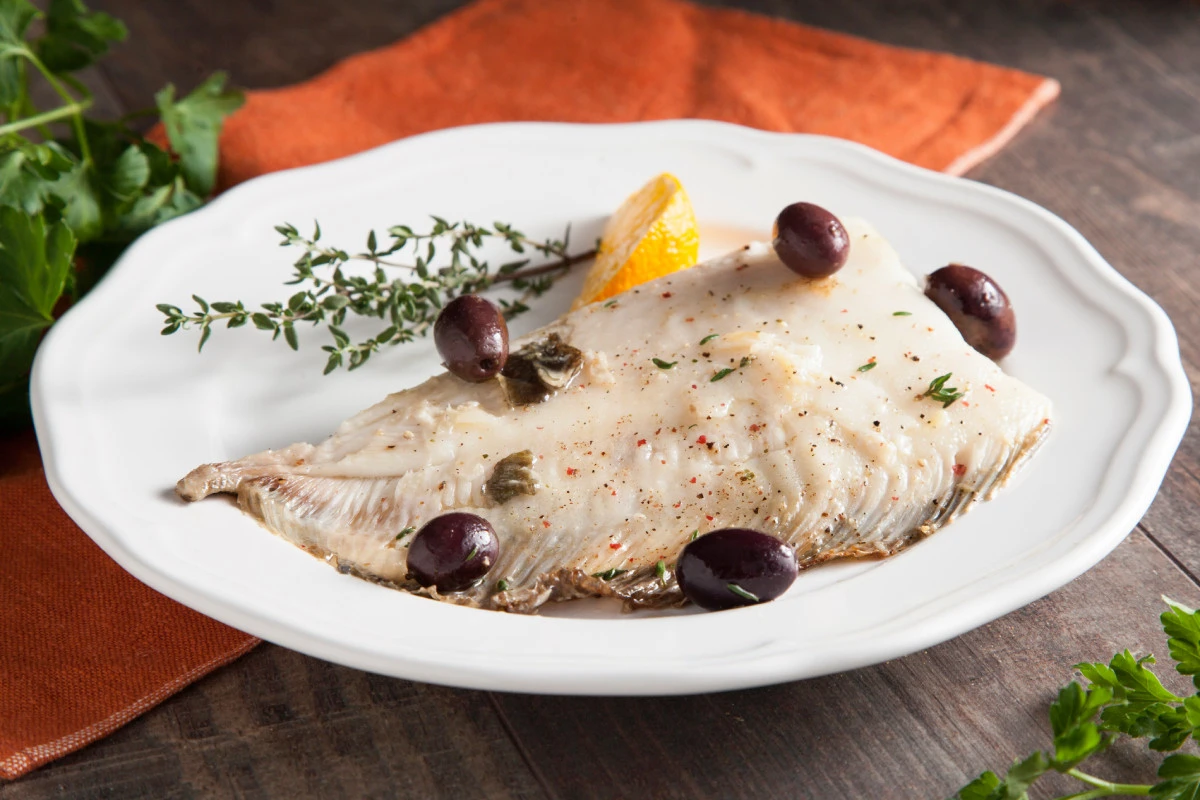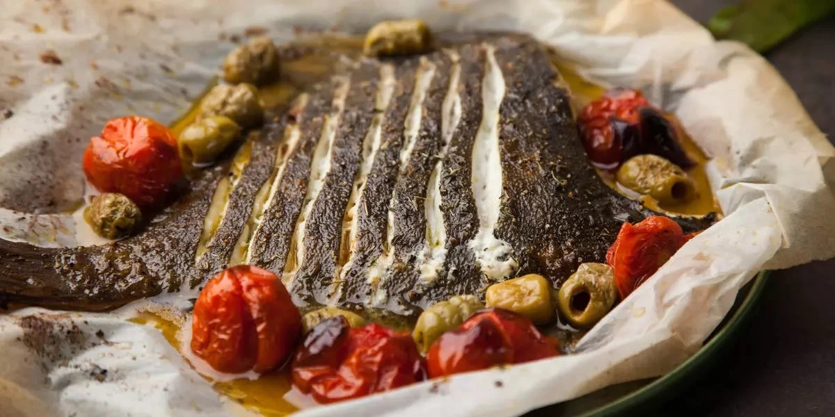 Камбала, запечённая с оливками и томатами черри