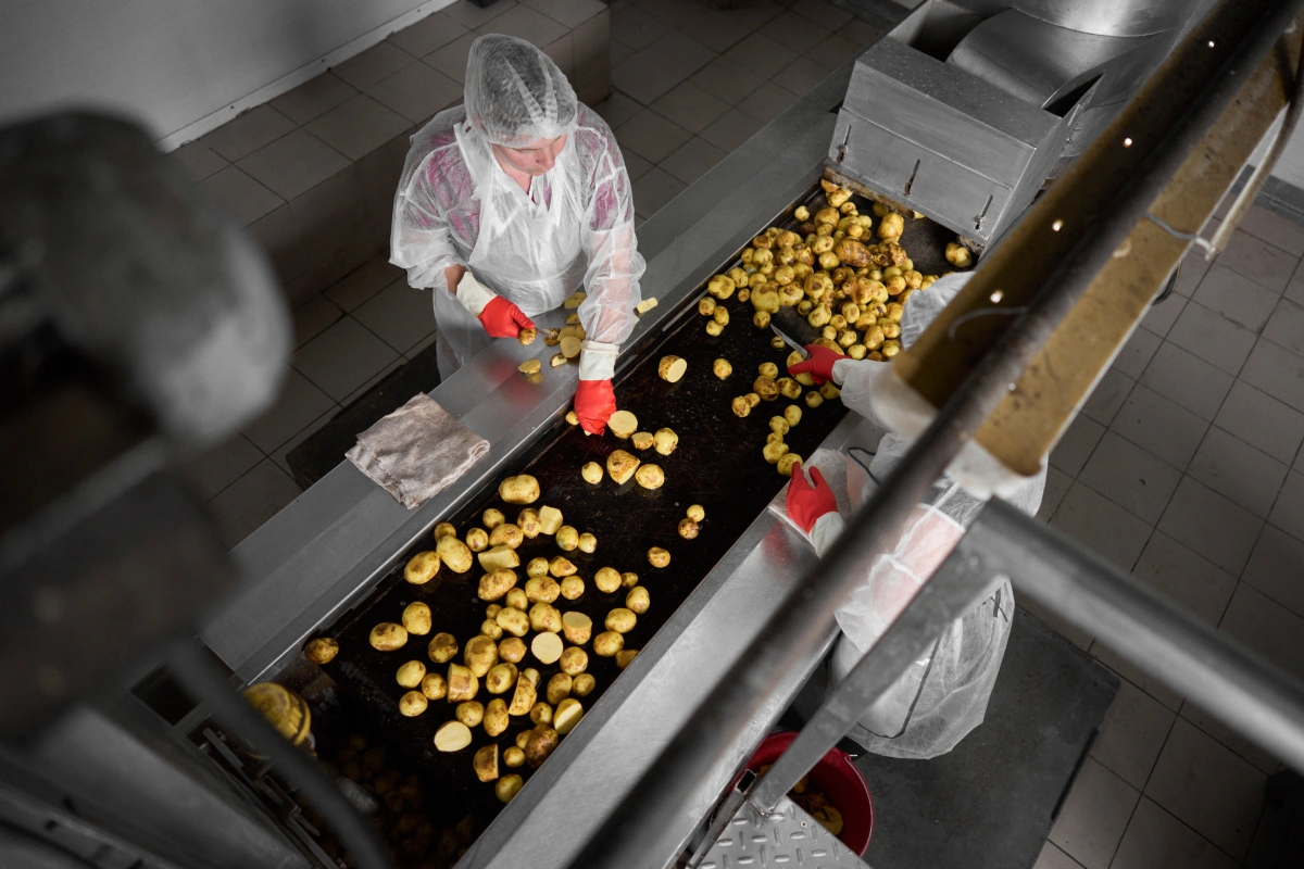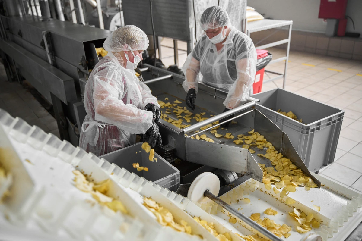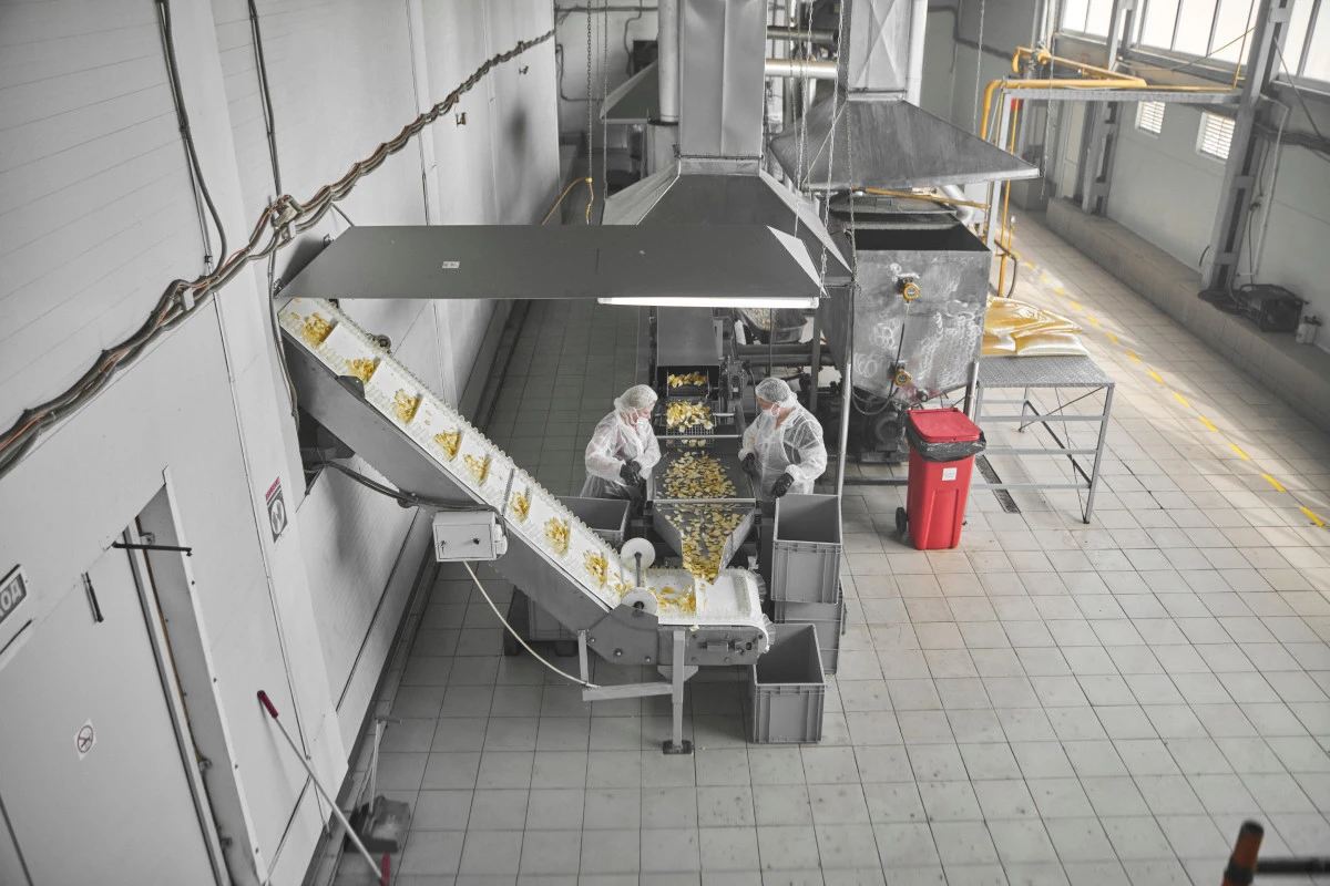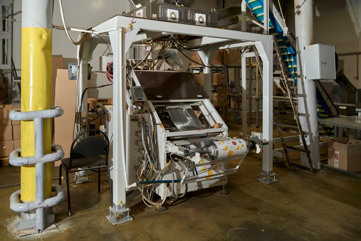 Затем сырьё взвешивают, отправляют на транспортёр — длинную непрерывную ленту, где картофель моют, чистят, нарезают, жарят, посыпают специями и фасуют по пачкам. За час через линию проходит 500 килограммов овоща. Скоро достроят вторую линию и станут перерабатывать в два раза больше сырья.