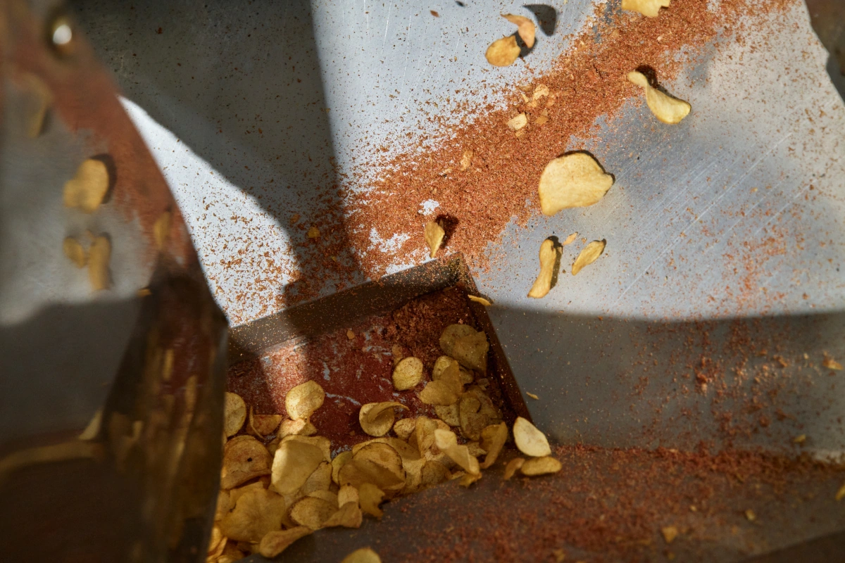 Специи приходят на фабрику уже готовыми, сухими и обязательно герметично упакованными, чтобы не допустить попадания влаги. Их загружают в барабан и аккуратно перемешивают с уже обжаренными картофельными ломтиками. Производитель специй сам разрабатывает вкусы под запросы технологов ВкусВилла. Скоро к основной линейке добавятся чипсы со вкусом пряного соуса чимичурри и креветок, лайма и чеснока.