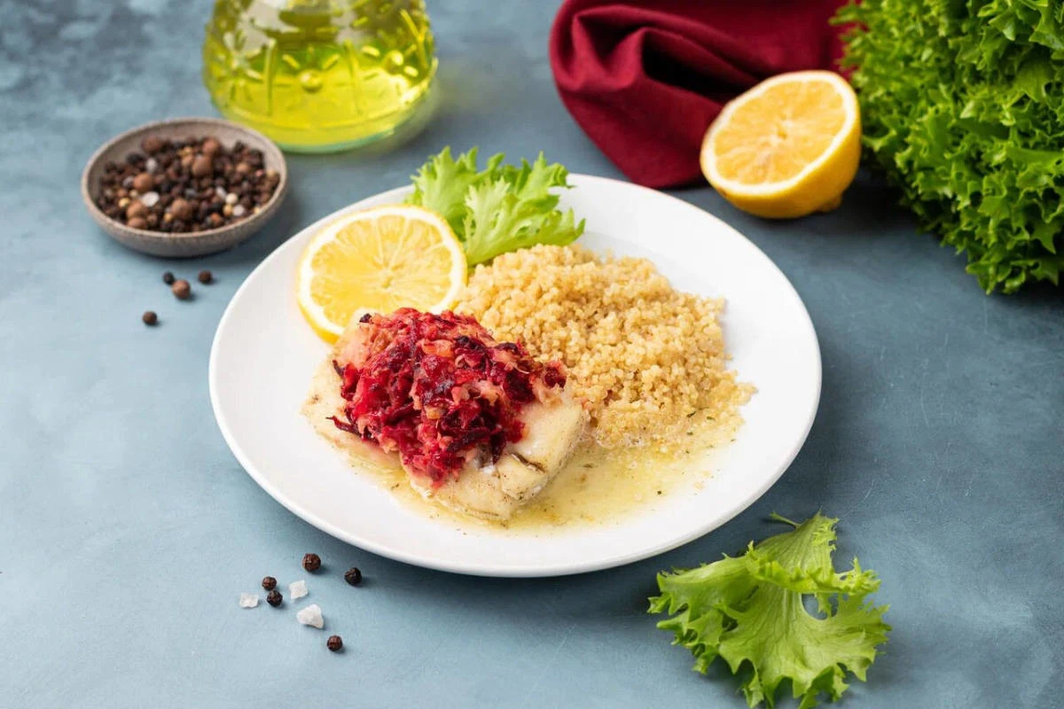 Морской окунь с киноа и грейпфрутом