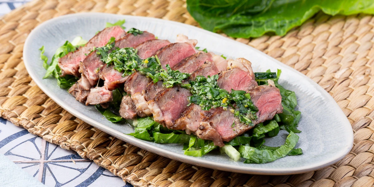 - Стейки нарежьте тонкими ломтиками. Выложите на тарелку зелёные ингредиенты, сверху — ломтики стейка. Полейте оставшейся заправкой и подавайте.