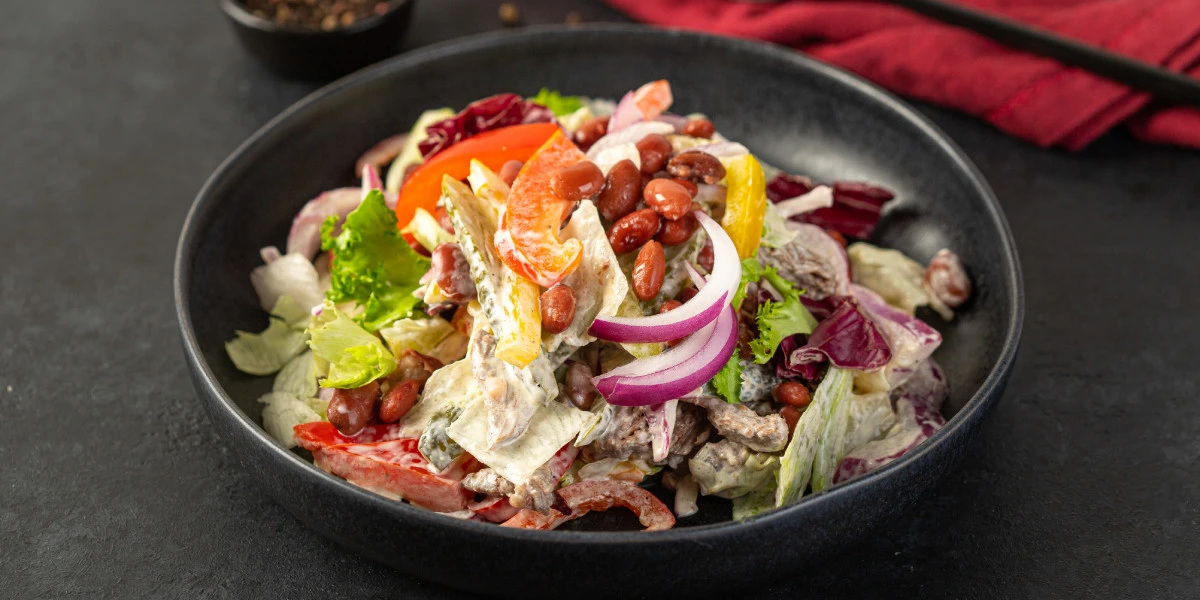 - Соберите салат порционно в тарелках или в большом салатнике. На подушку из листьев салата выложите овощи, мясо и фасоль, заправьте смесью майонеза с горчицей, при необходимости досолите.