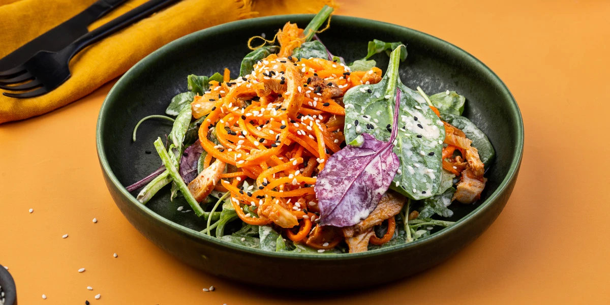- Выложите салатные листья с заправкой на тарелку. Сверху — курицу с морковью и кимчи. Украсьте семенами кунжута и подавайте.