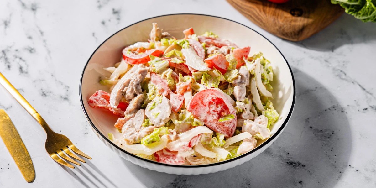 - Куриное филе нарежьте кусочками среднего размера, смешайте с помидорами и капустой. Заправьте салат соусом.
