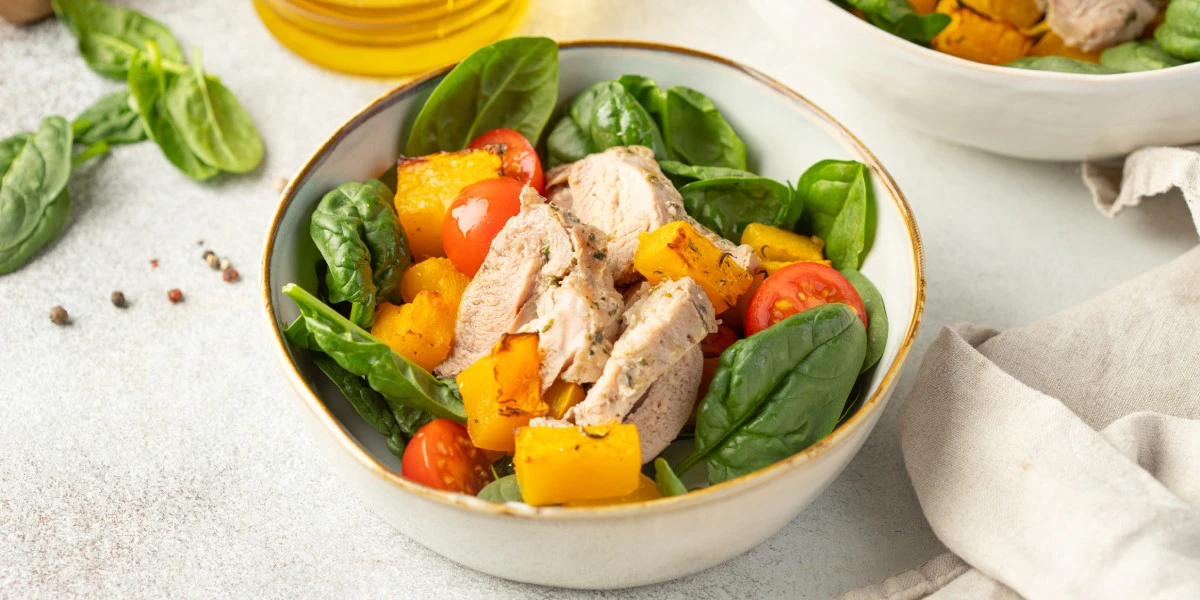 - Запечённую индейку нарежьте, выложите в салатник вместе с тыквой на подушку из шпината, добавьте половинки черри. Полейте оставшимся от запекания тыквы маслом и подавайте.