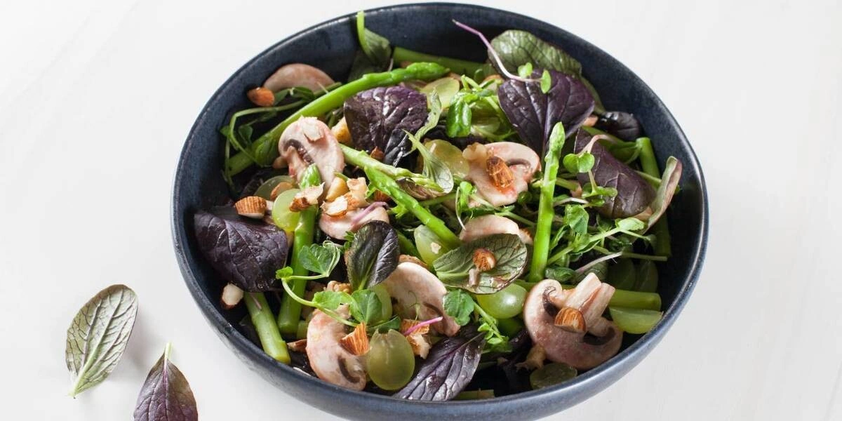 - Помойте салат, выложите на тарелки смесь пакчоя или пекинской капусты и микрозелени, сверху разложите спаржу, шампиньоны и виноград. Заправьте салат остатками заправки, посыпьте орехами и подавайте.