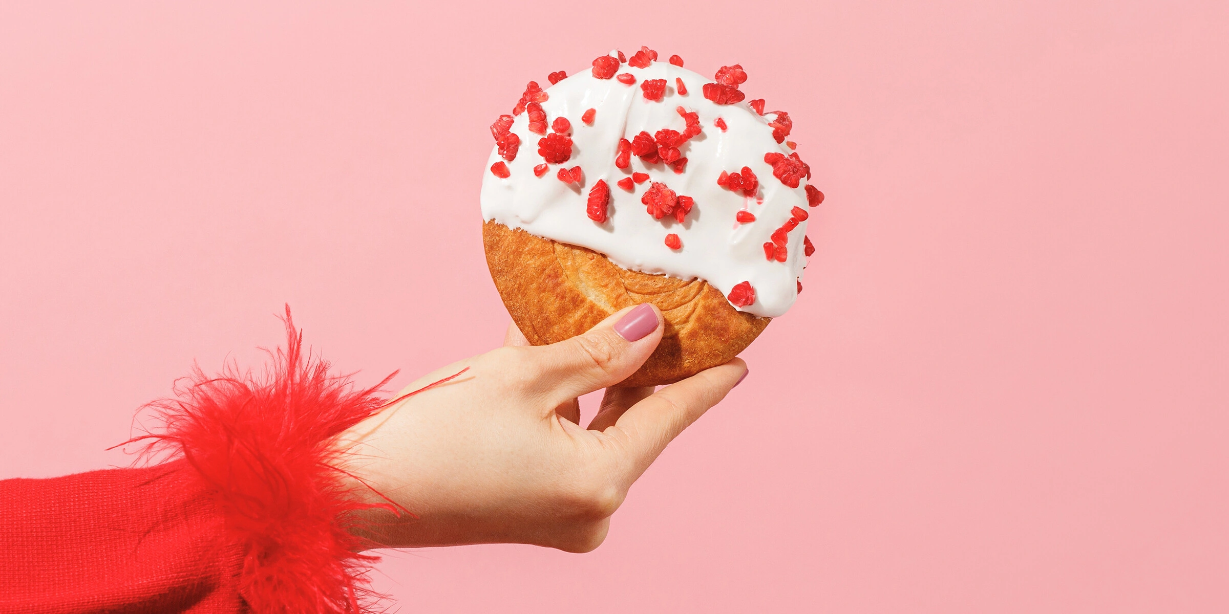 - Обмакните каждую булочку в меренгу до середины. По желанию украсьте сублимированной малиной.