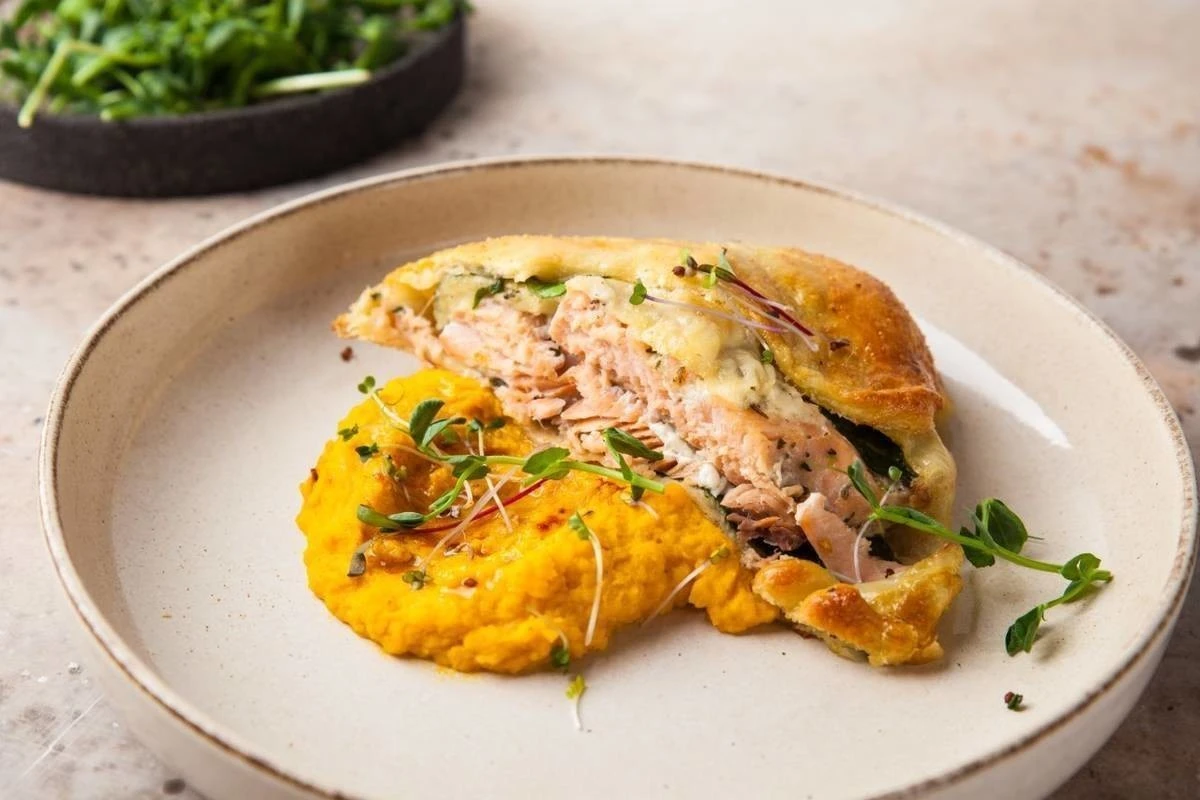 Попробуйте приготовить из кижуча блюдо, не уступающее ресторанным, — красную рыбу в тесте со шпинатом и хумусом из тыквы.
