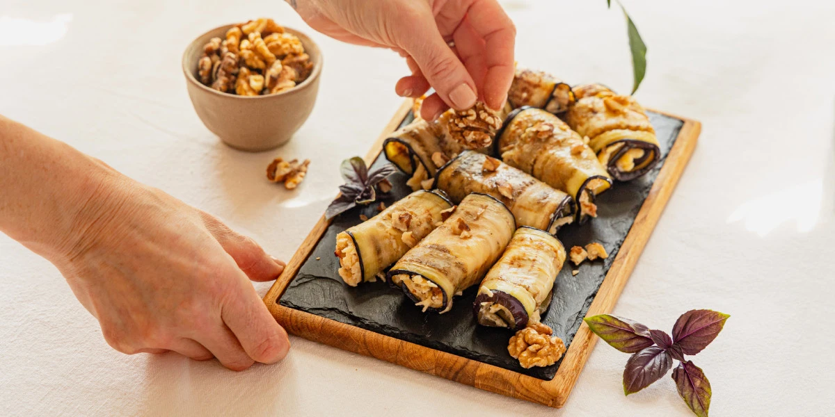 - Распределите начинку по каждому ломтику баклажана и сверните в рулетики в направлении от себя. Подавайте, украсив грецкими орехами и свежей зеленью.