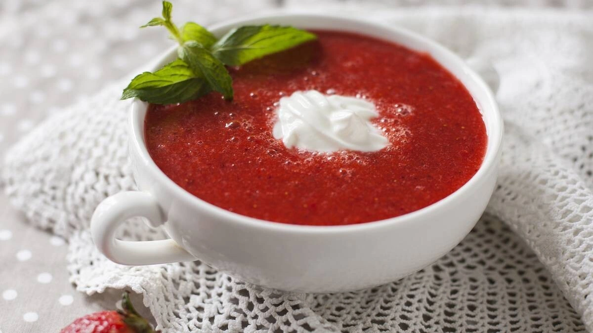 - Разлейте суп и положите в центр немного творога. Для аромата и вкуса можно украсить листьями мяты.