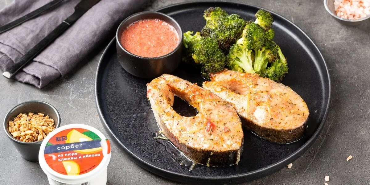- Подавайте форель с брокколи и соусом на основе сорбета с жареным луком.