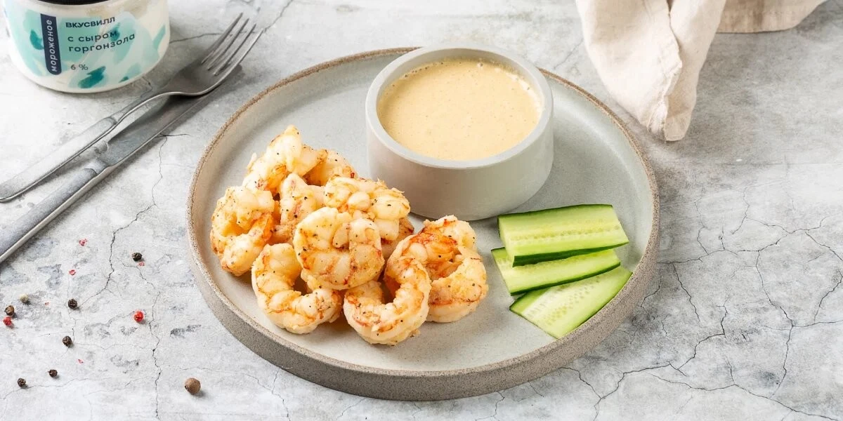 - Смешайте всё вместе блендером до однородности. Подавайте креветки с соусом.