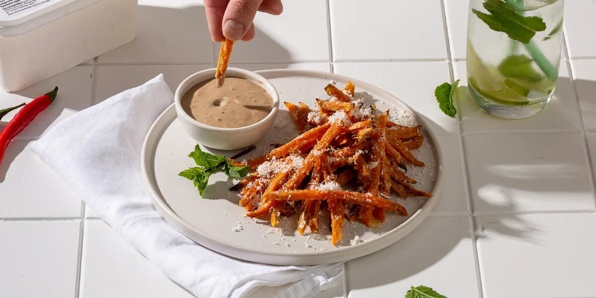 Новое прочтение картофеля фри с мороженым. Берём батат, запекаем (это полезнее, чем фритюр), подаём с пломбирным соусом. Весьма необычно, но в этом точно что-то есть!