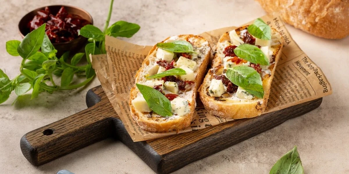- Мелко нарежьте вяленые томаты. Сыр нарежьте кубиками. Листья базилика или мяты отделите от стеблей.