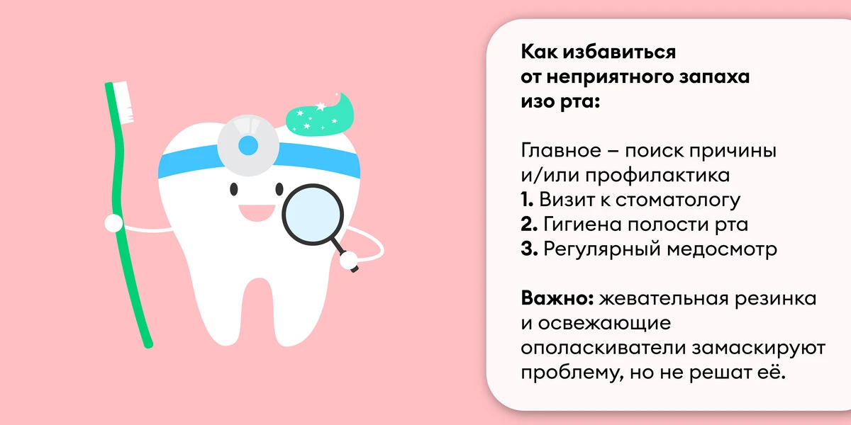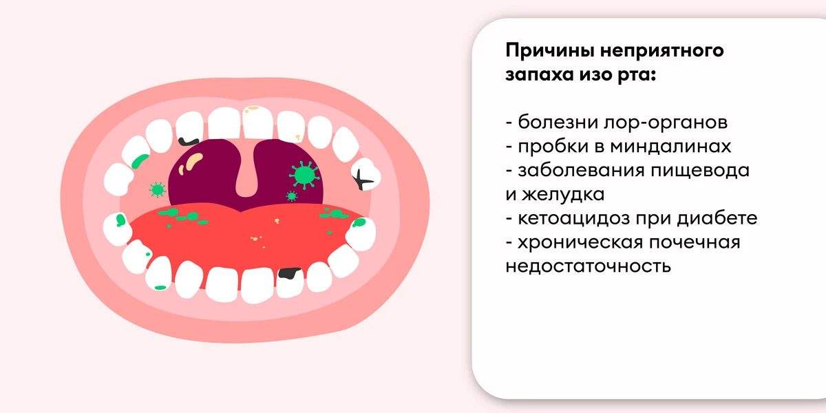 Недостаточная или неправильная гигиена полости рта, воспалительные процессы дёсен, многочисленный кариес или ненадлежащий уход за ортопедическими конструкциями (протезами и брекетами) — всё это может привести к росту бактерий и, как следствие, возникновению неприятного запаха.
