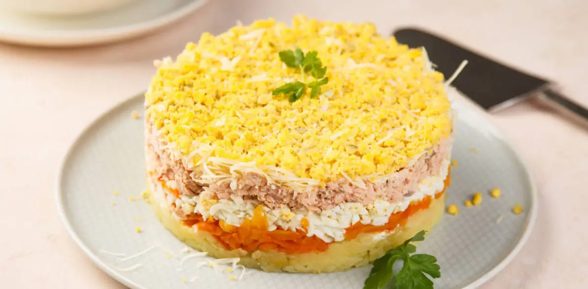 Неустаревающая классика праздничного стола. С копчёной горбушей мимоза получается особенно удачно, а ещё гауду можно заменить пармезаном – будет ещё вкуснее.