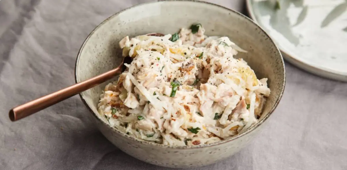 - Смешайте куриное мясо, дайкон и лук, посолите, заправьте майонезом и посыпьте рубленой петрушкой. Можно подавать!