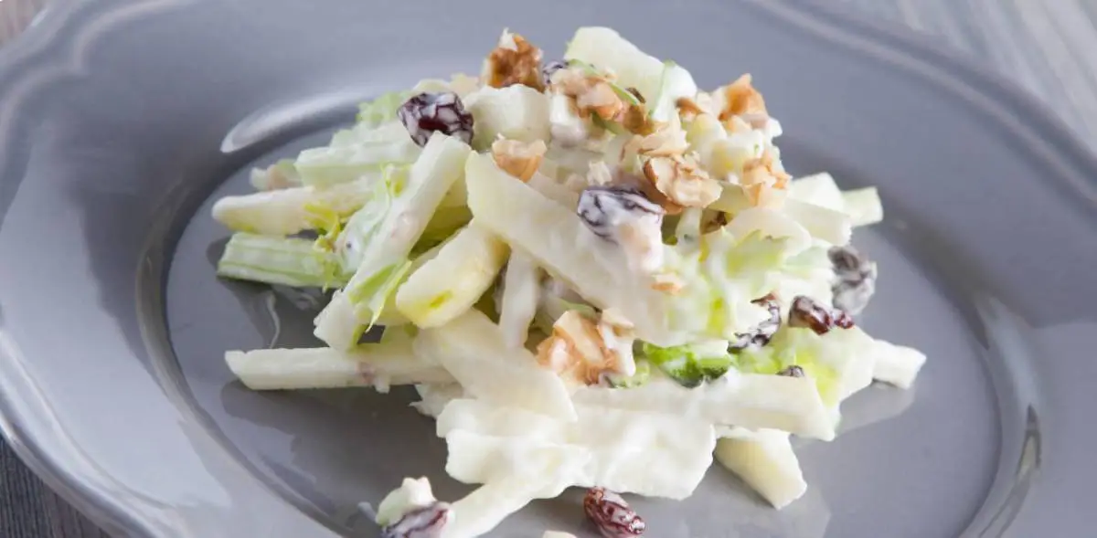 - Смешайте сельдерей, яблоко, изюм и половину орехов, посолите, поперчите и заправьте майонезом, перемешайте. Готовый салат посыпьте оставшимися орехами — и подавайте.