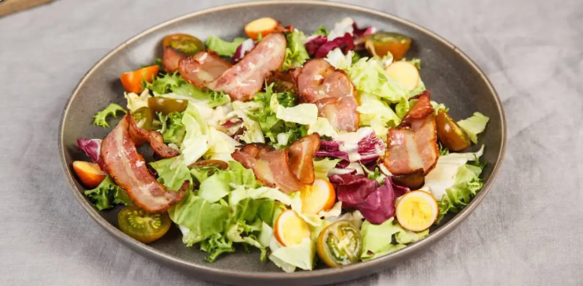 - Выложите салатные листья на тарелку, сверху разложите ломтики вяленой утки или шпека, яйца, черри, посолите и заправьте соусом. Салат готов.