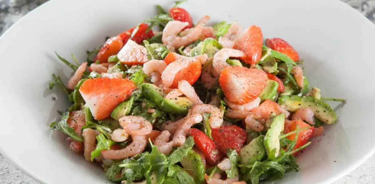 - Руколу помойте, обсушите и выложите в салатник, добавьте авокадо, креветки и клубнику, заправьте салат и перемешайте, поперчите и подавайте.