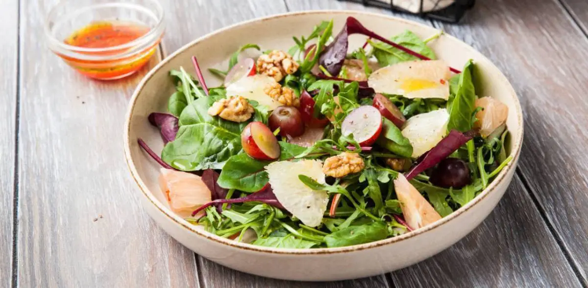 - Помело очистите от кожуры и нарежьте на крупные дольки. Виноградины разрежьте пополам. Орехи порубите.